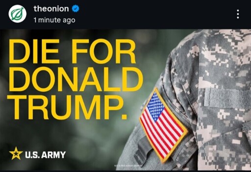 minus-squarepelespirit@sh.itjust.workslinkfedilinkEnglisharrow-up37·3 months ago“Die for Donald Trump and his family to make money.”