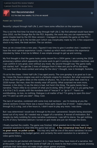 I personally played it some time after Portal 2, probably 2015 or so. I found it great, particularly as far as lore and pacing are concerned. Sure, there are bits that drag, characters that aren’t well written, and plot/lore details that are too ambiguous, but I’d much rather that than hand-holdy, surface-level plot of most similar shooters, or plot told through YouTube videos and flavor text like many modern shooters. IMO, its still one of the best at what it does, and its still a personal favorite for that reason.