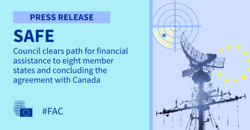The officials also adopted a decision authorising the EU to sign the bilateral agreement between the EU and Canada on the participation of Canadian companies and products originating from Canada in procurement under the SAFE Instrument.