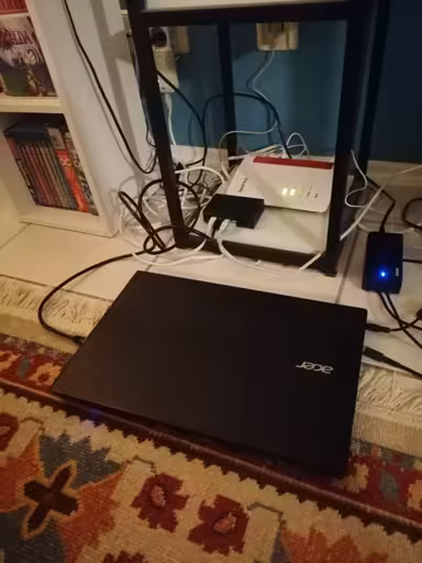 - Little bonus tangent: before I started working on the server, we’ve been having problems with our internet - think constant outages where regular restarting of the router was required only for another outage five minutes later. A technician came by and fixed it, but I was told to get a new router because a newer router would be able to fix some of the common issues you get internet access on its own. That’s what you see further to the back by the wall (50€ used, Fritz!Box 7510). Unfortunately, it only comes with one (1!!!) singular LAN port, so I had to buy a switch for 5 LAN ports in total (another 12€) which is sufficient for all the devices we use at home.